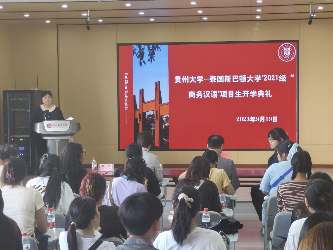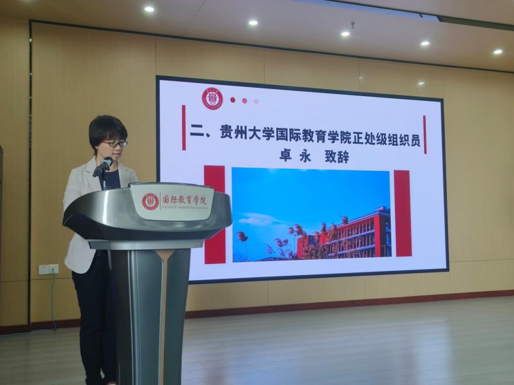 受因公出差的国际教育学院院长宁梅委托,卓永在开学典礼上致辞。她代表贵州大学国际教育学院的全体教职员工和广大留学生老生同学们,欢迎贵州大学—泰国斯巴顿大学合作项目的新同学。她强调,贵州大学和斯巴顿大学都是历史悠久,底蕴深厚的学校,贵州大学国际教育学院也是广大留学生同学的家;她希望留学生同学们认真学习中文,努力钻研商务汉语专业知识,用心感受中国文化,练就过硬的国际交流能力,成为中泰各行各业友好合作的桥梁和中泰文化交流的使者。