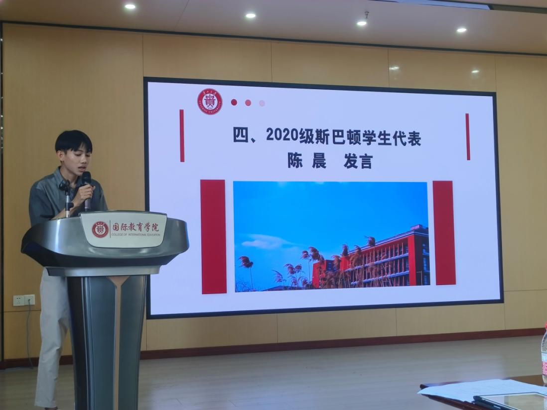 2020级项目生陈晨代表老生发言。他向新同学介绍了在贵州大学丰富多彩的校园生活,表示贵州大学国际教育学院就像他的家一样温暖,在老师和同学们的帮助下,自己各方面能力都得到了培养和提高。