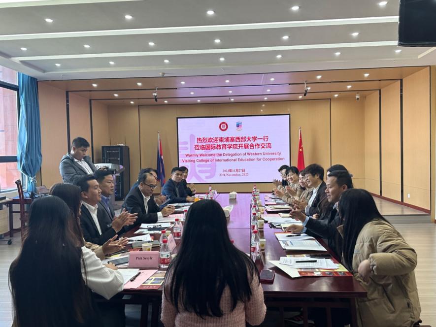 2023年11月27日下午,柬埔寨西部大学董事会主席泰·洛伦特、校长金·罗塔纳、学术事务副校长特里·索提瑞、副校长霍克·塔乌特、研究生院院长龙·索旺、酒店管理与旅游学院院长龙·本腾、医务室主任蔡·利亚克纳、学生事务代理主任李通等一行八人莅临我院开展合作交流,贵州大学国际教育学院院长宁梅、党委副书记甘孝琴(主持党委工作)、副院长梁雪、柬埔寨籍留学生代表以及学院相关科室人员参加会议,座谈会由甘孝琴主持。