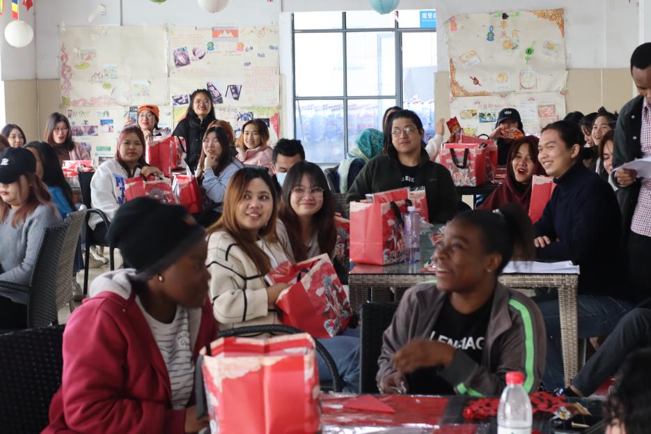 随后,宁梅及辅导员、班主任老师一起为留学生们送上了春节礼包,袋中红红的大苹果、大白兔奶糖以及各种口味的糖果与零食代表了学院对同学们的祝福,希望大家龙年平平安安、健康快乐。