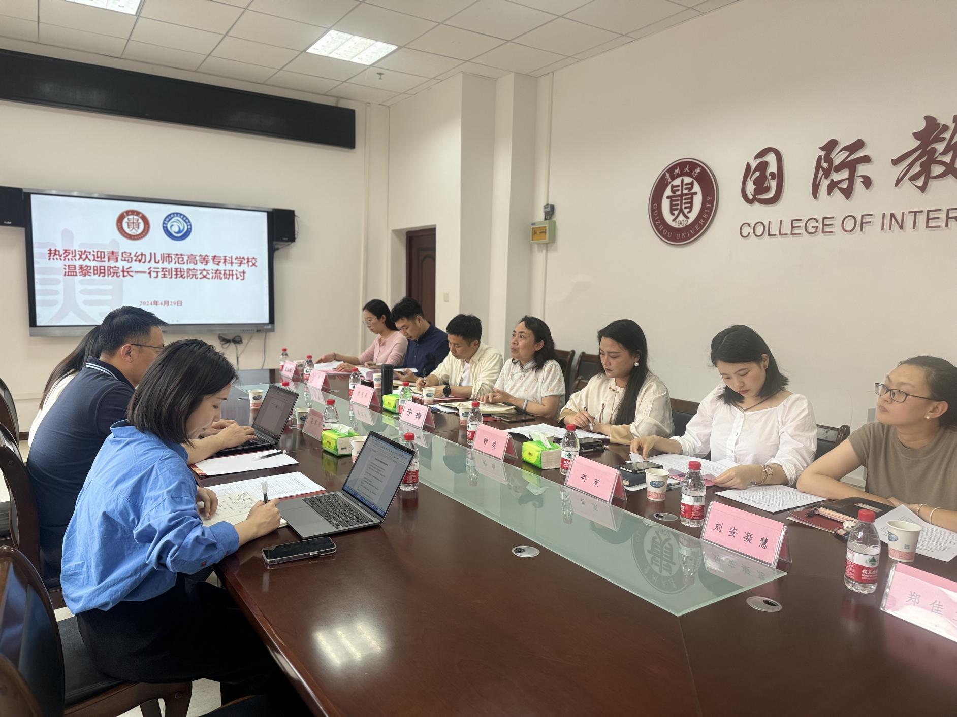 2023年6月,我院代表贵州大学成功承办由教育部留学服务中心主办的“我与中国的美丽邂逅——邂逅中国乡村·美丽贵州行”来华留学生社会实践活动。2024年,此项活动将由青岛幼儿师范高等专科学校接力承办。为此,4月29日,青岛幼儿师范高等专科学校外国语学院(筹)院长温黎明率领团队到我院开展交流研讨。我院院长宁梅以及学院2023年“邂逅中国乡村·美丽贵州行”活动专班工作人员参加了交流研讨。