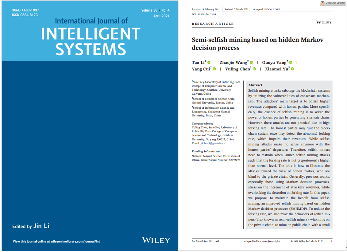 计算机科学与技术学院、省部共建公共大数据国家重点实验室(筹)2020级软件工程专业博士生李涛在区块链技术和机器学习方面取得重要进展,其研究成果“Semi-Selfish MiningBased on Hidden Markov Decision Process”( Int J Intell Syst. 2021;1‐17. )在计算机科学领域著名国际学术期刊International Journal of Intelligent Systems(一区TOP,IF:10.312)上发表。该期刊是计算机科学与人工智能领域最重要的期刊之一,该期刊旨在报道计算机科学和人工智能方向的最新研究成果,是计算机领域享有高度学术声誉的期刊之一。贵州大学为第一署名单位,博士研究生李涛为第一作者,联合指导老师陈玉玲副教授为通讯作者。自私挖矿攻击是利用区块链共识机制的缺陷而蓄意破坏区块链系统的一种攻击方式。攻击者通过浪费诚实矿工的算力来实现增加自己收益的目的。但是由于这种攻击方式会引起很高的分叉率,容易被诚实矿工检测到,而会导致诚实矿工退出挖矿,导致区块链系统的稳定性受到冲击。所以,自私挖矿攻击自提出到目前阶段,还是纸上谈兵的一种理论成果。该团队的工作是提出了半自私挖矿攻击的概念,从半自私矿工的视角,利用隐马尔科夫决策过程来分析可观察状态和不可观测状态之间的变换,通过均衡分叉率和收益,使得半自私挖矿攻击更具可操作性。仿真实验结果表明,半自私挖矿攻击在小幅降低收益的情况下,使得分叉率明显降低。
