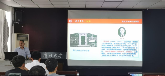 最后一位宣讲人李旭峰老师宣讲主题为贵大历史。他从贵大成立,贵大名字和贵大发展成就等多方面向我们展示了贵大一路走来的艰辛历程,并殷切希望各位学子认真践行明德至善,博学笃行的校训,为做强贵州大学贡献自己的力量。