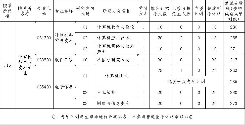 表1:计算机科学与技术学院2023年硕士研究生招生计划表