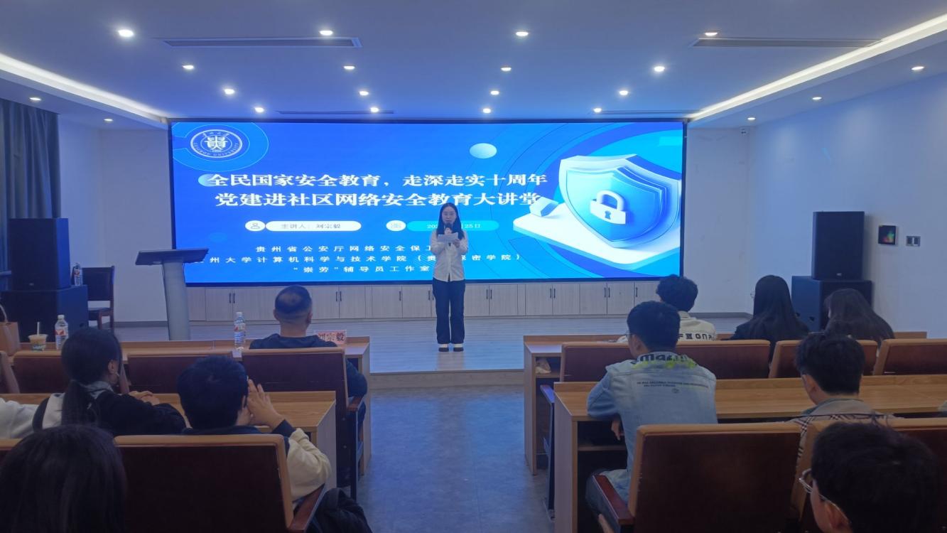为深入学习贯彻习近平总书记关于总体国家安全观的重要论述,增强师生的网络安全意识,维护校园网络安全稳定,2025年4月25日,在贵州大学东校区博学楼13楼报告厅,贵州省公安厅网络安全保卫总队与贵州大学计算机科学与技术学院(贵州保密学院)共同举办“全民国家安全教育,走深走实十周年”网络安全教育大讲堂,活动由贵州省公安厅网络安全保卫总队刘宗毅主讲,180余名师生代表参加。