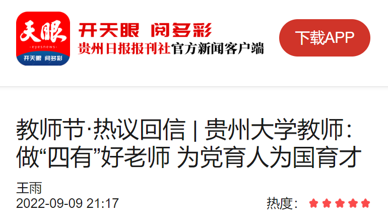 习近平总书记给北京师范大学“优师计划”师范生的回信,引起了贵州大学广大教师的热议。大家纷纷表示,要做“四有”好老师,坚持为党育人、为国育才,努力为贵州教育事业高质量发展贡献自己的力量。