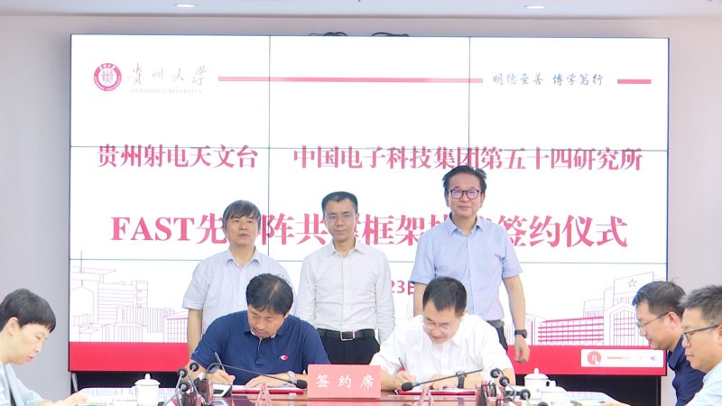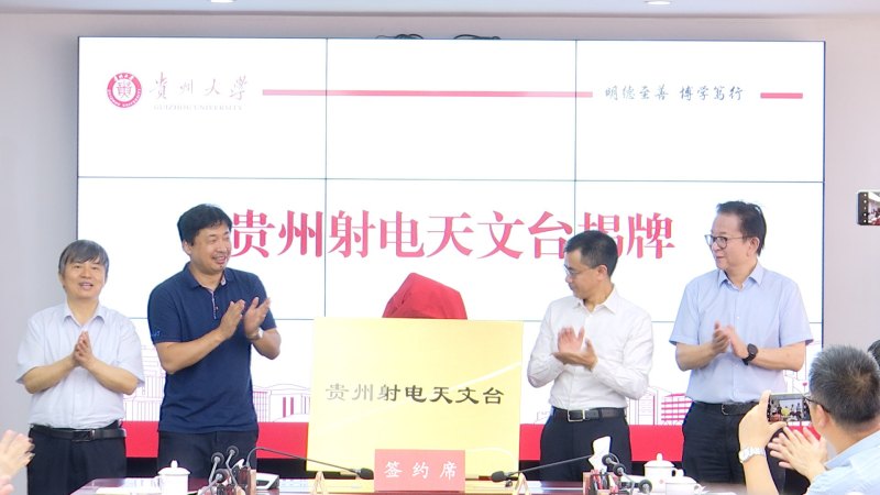 9月23日,贵州省科技厅—贵州大学科技合作协议签约、贵州射电天文台揭牌暨在我校西校区贤正楼举行。省科技厅党组书记、厅长项长权,党组成员、副厅长安守海,贵州射电天文台台长姜鹏,中国电子科技集团公司第五十四研究所副所长张旺,我校党委书记李建军,校长宋宝安院士,副校长吴攀出席签约仪式。