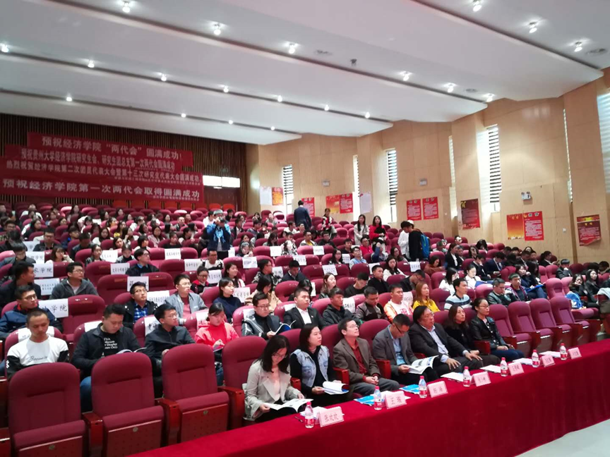 2018年10月12日下午2:30,贵州大学经济学院第二次研究生团员代表大会暨第十三次研究生代表大会在贵州大学机械工程学院圆形报告厅顺利召开。出席本次大会的有贵州大学党委研究生工作部张小彬,经济学院院长王秀峰教授,副院长马红梅教授,党委副书记杨海老师,MF中心办公室卢文璟老师,研究生科科长王瑞老师、辅导员张欢欢老师,以及贵州大学研究生团委、贵州大学研究生会、贵研新闻社、三助中心、溪山艺术团、研习社、贵州大学博士生会七大组织以及机械工程学院、资源与环境工程学院、外国语学院等各兄弟学院的研究生团总支、研究生会负责人。