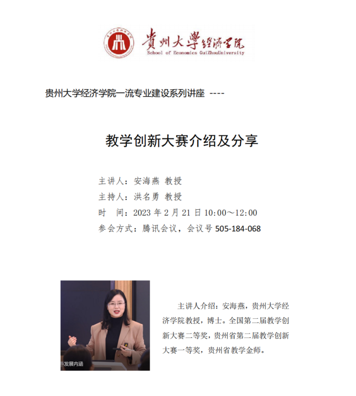 2月21日上午,经济学院组织开展了一流专业建设系列讲座。本次讲座邀请到了学院农林经济管理教研室主任安海燕教授为学院老师做全国高校教师教学创新大赛的介绍与分享。