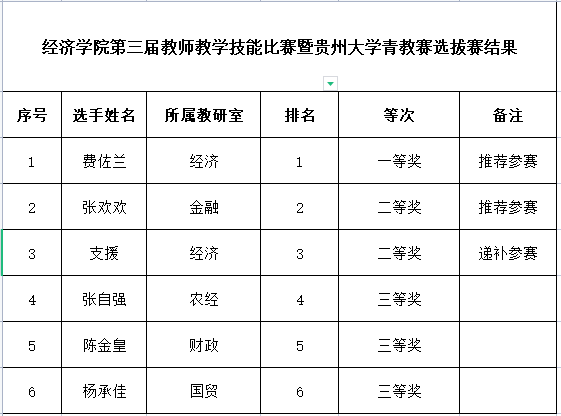 最终,经过教学设计、课堂教学和教学反思三部分的考核,共评出一等奖一名、二等奖两名、三等奖三名。其中费佐兰老师和张欢欢老师将代表学院参加贵州大学2023年青教赛。