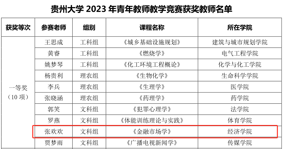 经济学院在贵州大学2023年青年教师教学竞赛中取得优异成绩。学院财政与金融系张欢欢老师获文科组一等奖,经济与贸易系费佐兰老师获文科组二等奖。