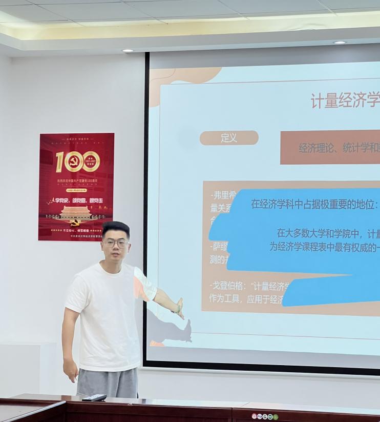 青年教师何畏声音洪亮,精神饱满,高度提炼总结计量经济学背后的经济概念和思想逻辑,展现青年教师对课堂的激情和专注。
