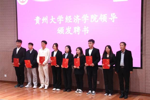 接着,院党委书记胡环宇讲话。他对上一届学生会、研究生会的工作表示肯定,对为经济学院辛勤付出的各位同学表示感谢,同时也指出了目前工作中存在的不足。他强调,学生会和研究生会需要在服务意识、团队协作精神和勇于创新方面继续加强建设,平衡好学习和工作的关系,并对新一届学生会和研究生会提出了要求及期望。随后,院领导王忠於、向秋丹、朱满德为2023-2024年度本科生和研究生干部颁发荣誉聘书并合影留念。