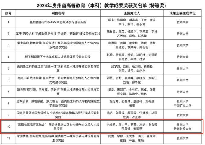 学院院长洪名勇教授主持的《“三瞄准三培育三融合”:服务多民族山区乡村振兴的农经人才培养探索》项目获贵州省高等教育(本科)教学成果奖特等奖;经济与贸易系江东坡副教授主持的《基于实践和人文双重关怀的本科生导师制实践探索》项目获省教学成果三等奖。