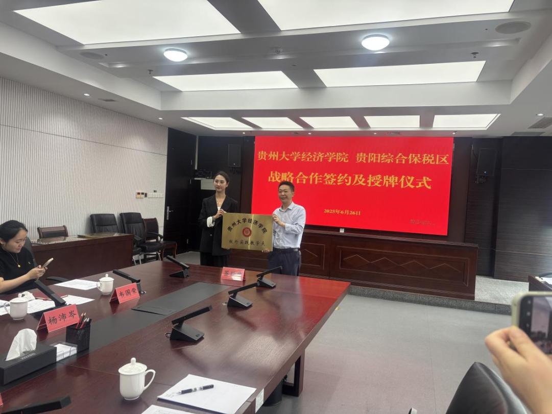 2025年6月26日,我院与贵阳综合保税区管委会举行战略合作签约及授牌仪式,正式搭建实习实践基地、校外实践教学点、人才培养基地战略合作平台。书记胡环宇、学生科副科长蒋信炜、国际经济与贸易专业负责人李玉娟和杨承佳老师出席仪式。胡环宇书记与区党工委副书记肖伦文共同签署战略合作框架协议并共同揭牌。