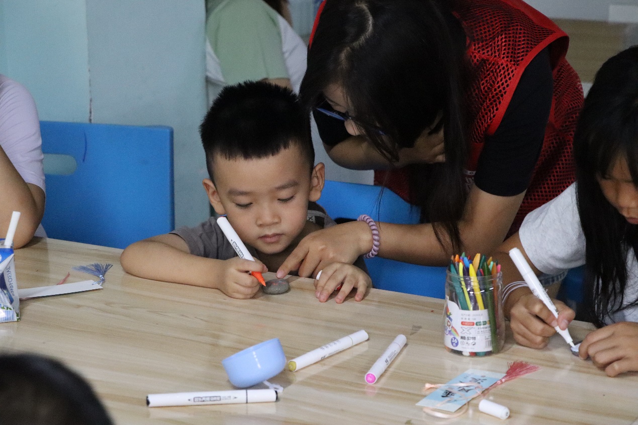 石头彩绘是孩子们满心期待的手工时光,小朋友们端坐在座位上,面前摆着圆滚滚的鹅卵石,手里攥着彩色画笔。在他们的笔下蓝色的小鱼驮着彩虹云朵“游”出石面,绿盈盈的小草“破石而出”,果树与花瓣在石上共舞……孩子们纷纷展开想象的翅膀,在平平无奇的石头上,一笔一画勾勒出藏在心底的独特巧思,让每块石头都绽放出专属的童趣光彩。