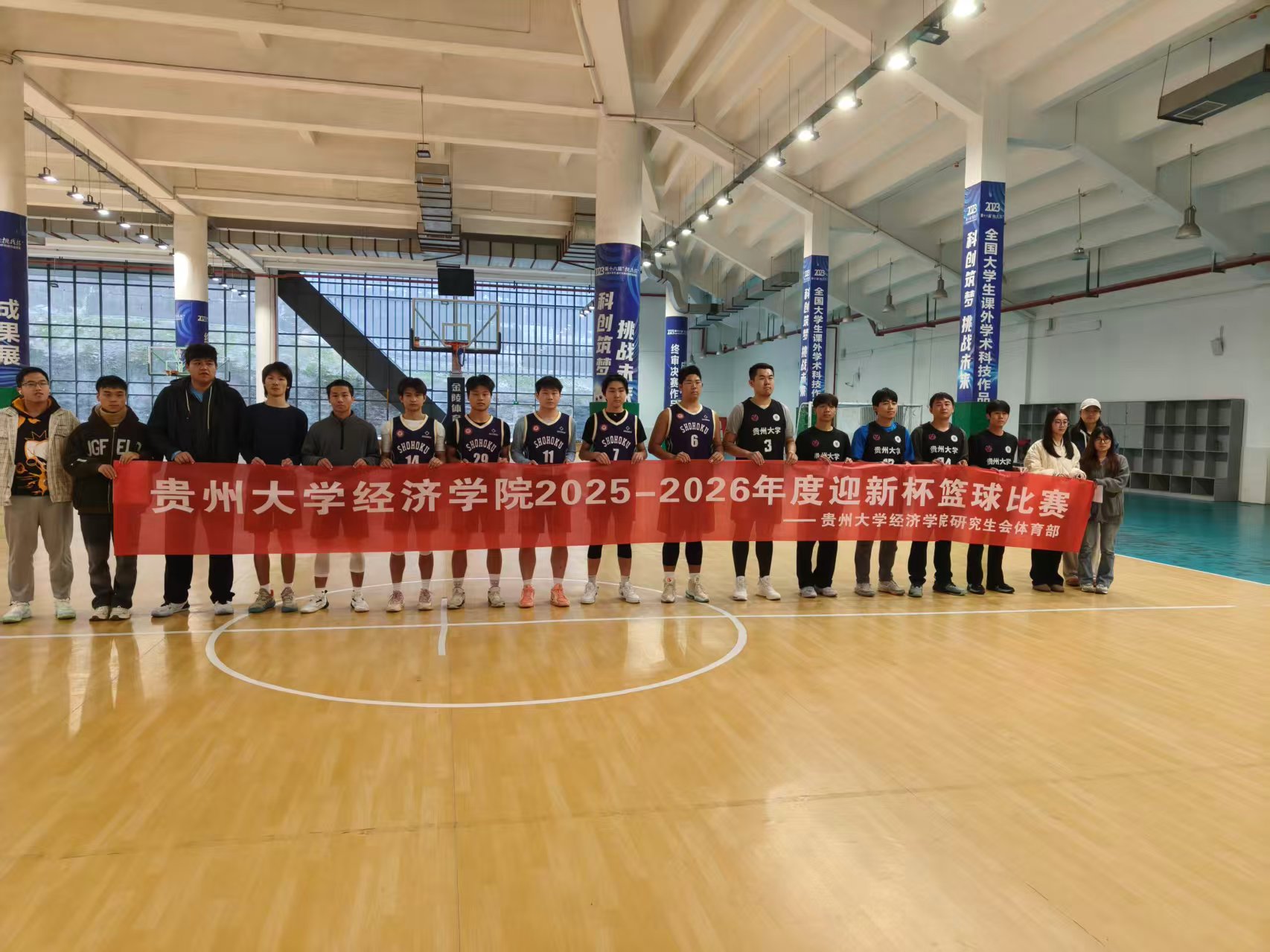 为迎接我院2025级新生,增强同学们的身体素质,展示出新时代大学生的蓬勃朝气和竞技热情,2025年10月26日上午10点,经济学院2025年度“迎新杯”篮球赛开幕式在贵州大学西校区室内体育馆顺利举行。