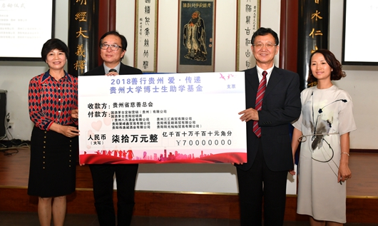 据了解,“爱•传递”贵州大学博士生助学基金由省慈善总会牵头,茅台定制酒公司出资,启动资金为70万,首批资助我校40名贫困博士研究生。受助学生每人每年将获资助10000元。