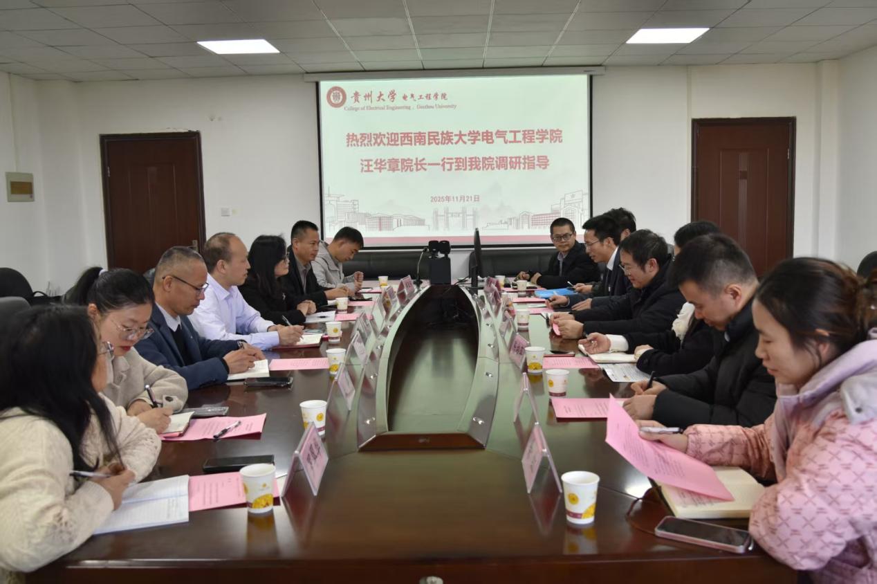 20251121日下午,西南民族大学电气工程学院院长汪华卓等一行七人来校调研交流,双方在电工楼607举行了座谈会。学院党委书记刘明锋、副院长吴钦木、陈湘萍和电力系主任韩松、自动化系主任王霄和有关人员参会。副院长吴钦木主持会议。