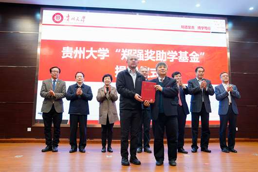 On the morning of March 21, a donation ceremony for the "Zheng Qiang Scholarship Fund" was held in the lecture hall of the Xianzheng Building on West Campus. Prof. Zheng Qiang, the former GZU president and honorary director of the fund’s management committee, leaders from the Guizhou provincial government and Guizhou University, and about 300 faculty and student delegates attended the ceremony. Vice President Li Junqi presided over the ceremony.