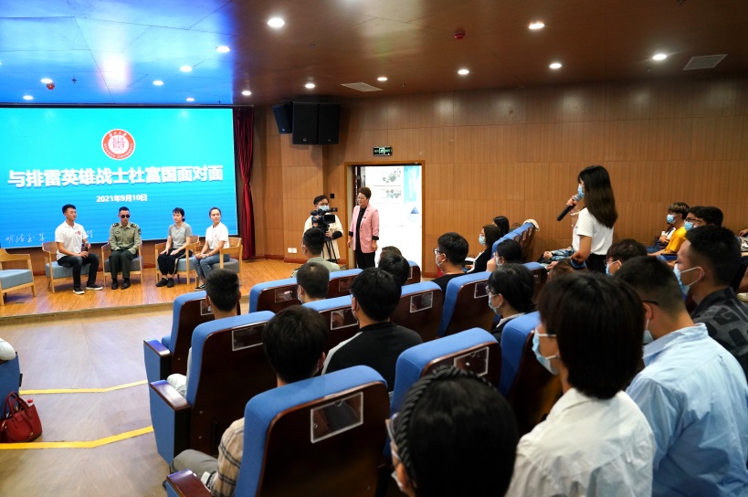 In Linghu Caitao’s speech, she hoped students present could be inspired and learn something significant from the heroic deeds of Du Fuguo through the interview. She encouraged them to shoulder their responsibilities of the new era and act upon the spirit of the university’s motto, which underscores seeking utmost virtues and academic excellence. Likewise, students must therefore combine their pursuit of ideals with the great cause of national development, remembering that to achieve success we must have an eye to the long-term future. Everyone concerned in this effort must strive to make achievements in the new era and live their life to the fullest.