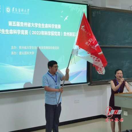 The flag of the Guizhou Provincial College Students Life Science Competition is handed to Professor Fang Zhongming of the Agricultural College of GZU.