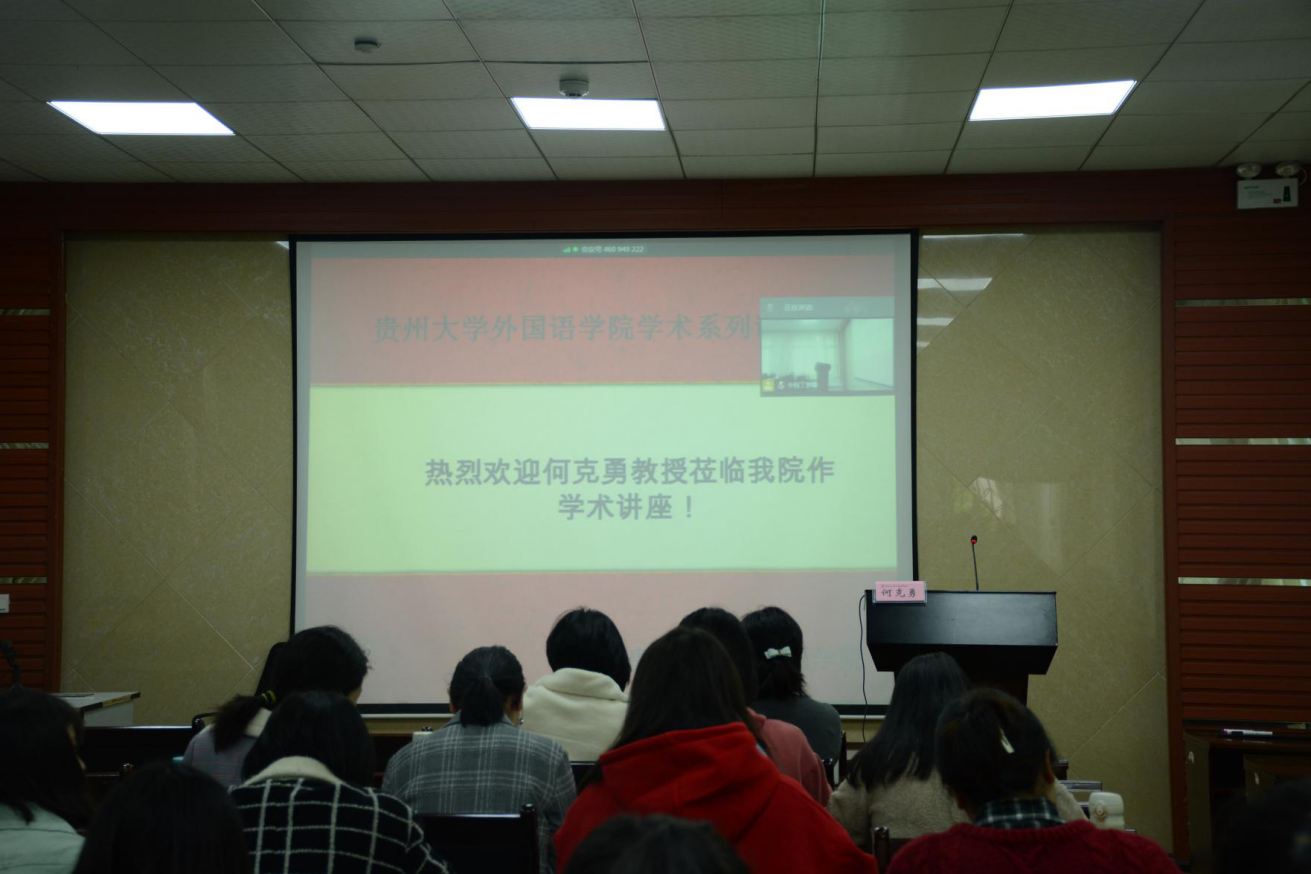 2021年4月15日下午2点,由贵州大学外国语学院主办的2021年第1期外国语学院学术系列讲座在外语楼201室举行。本次讲坛特邀中央民族大学外国语学院翻译系教授、博士生导师、国家社科基金重大项目评审专家、中国翻译协会专家会员何克勇教授作题为“影视剧翻译的标准——贴:一种理论探讨”的学术讲座。讲座由外国语学院陈娟副教授主持。外国语学院百余名师生到场聆听讲座。