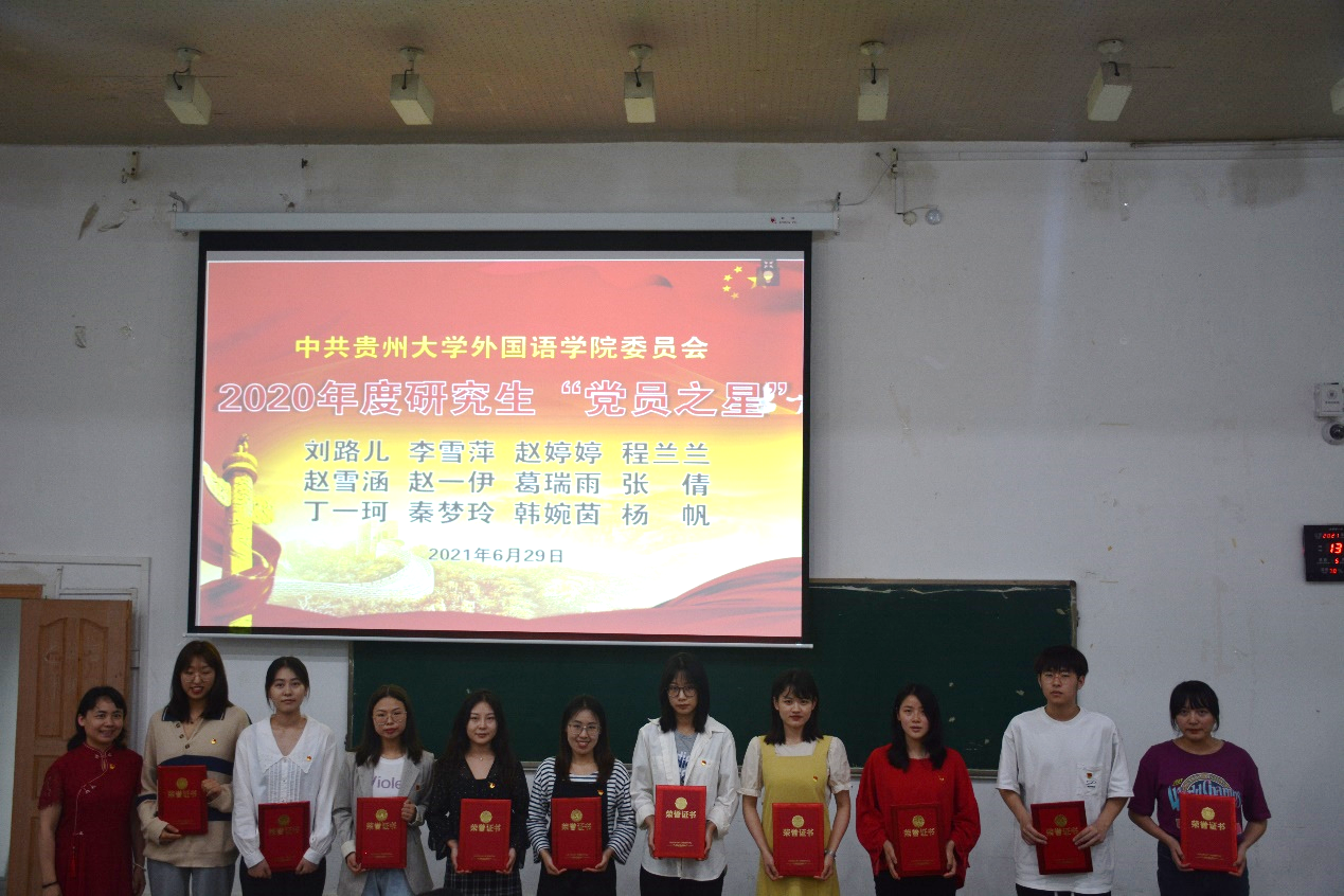 接下来,龙汶书记宣读了表彰文件《中共贵州大学外国语学院委员会关于表彰2020年度“五创、五比、五亮”活动“五星支部”和“党员之星”的决定》。党委书记龙汶、院长周杰、副院长宁梅分别为受表彰的“五星支部”和“党员之星”颁奖。