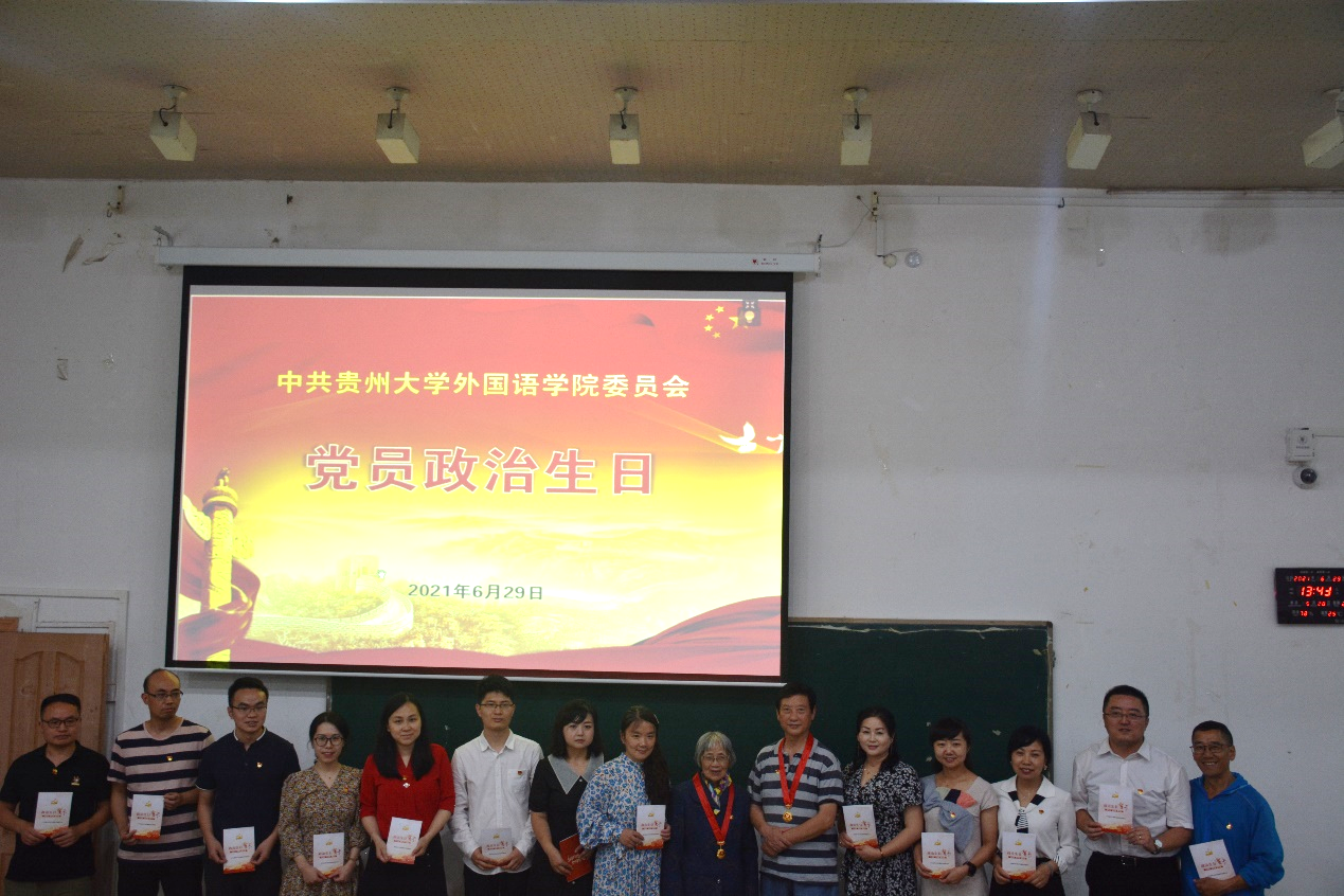 外国语学院党政办讯6月29日,我院在外语楼212DT阶梯教室召开庆祝中国共产党成立100周年暨“七一”表彰大会。贵州大学原外语系党总支书记、校党委原副书记郑元宁同志,贵州大学原外语系基础英语教研室主任王兴均同志,外国语学院党委书记龙汶同志,党委副书记、院长周杰同志,党委委员、副院长宁梅同志,副院长王晓梅以及新老党员代表。会议由杨莉萍主持。