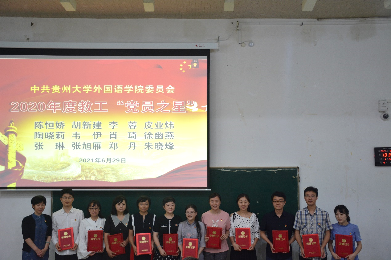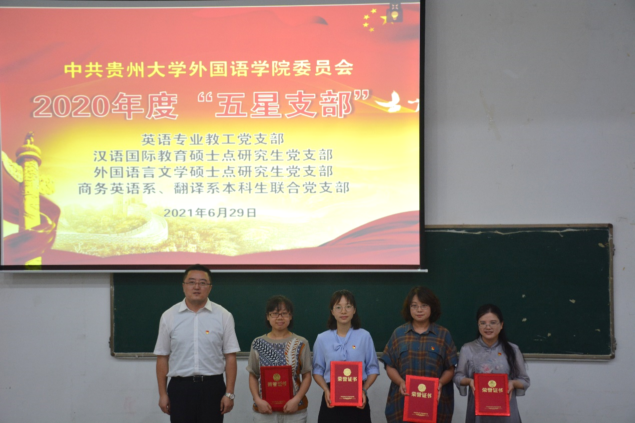 接下来,龙汶书记宣读了表彰文件《中共贵州大学外国语学院委员会关于表彰2020年度“五创、五比、五亮”活动“五星支部”和“党员之星”的决定》。党委书记龙汶、院长周杰、副院长宁梅分别为受表彰的“五星支部”和“党员之星”颁奖。