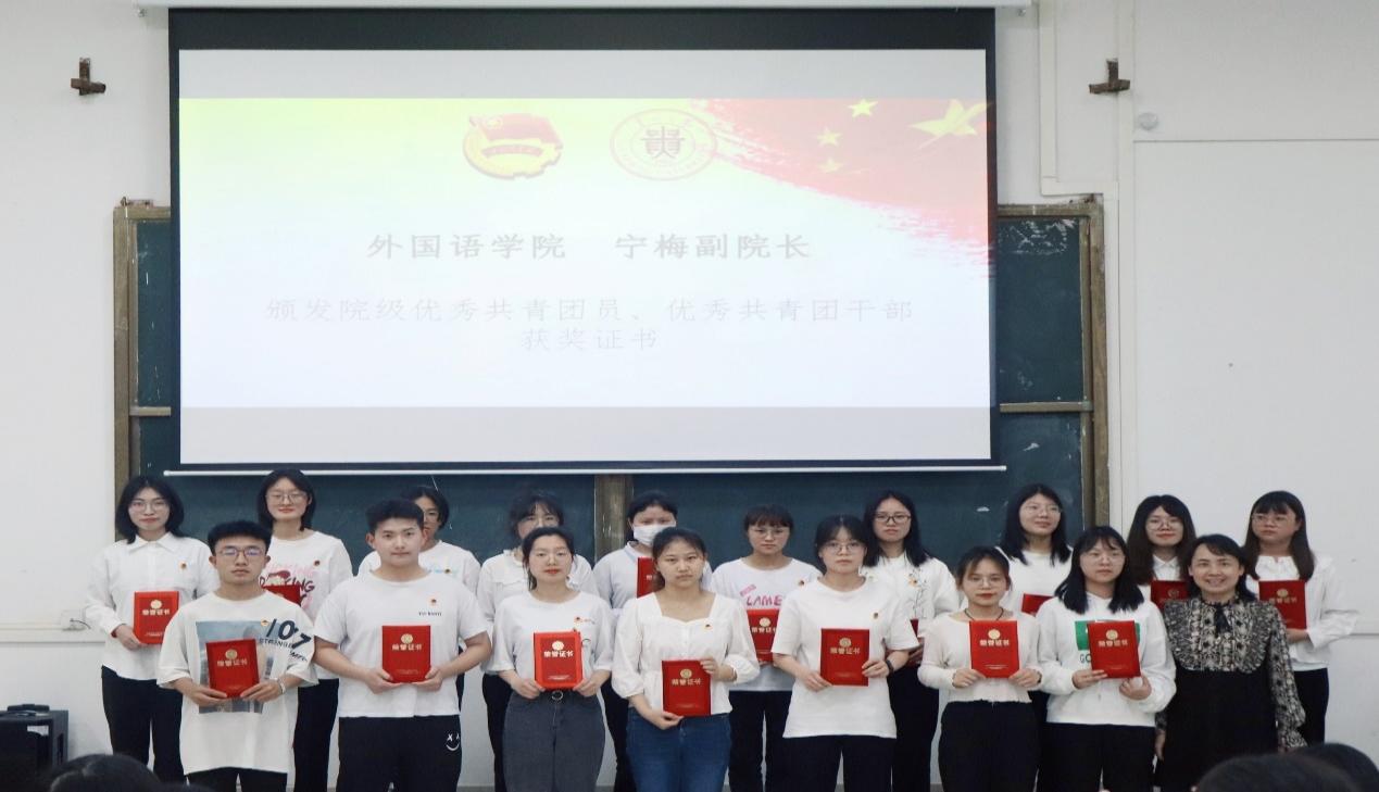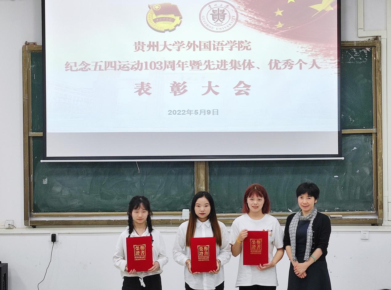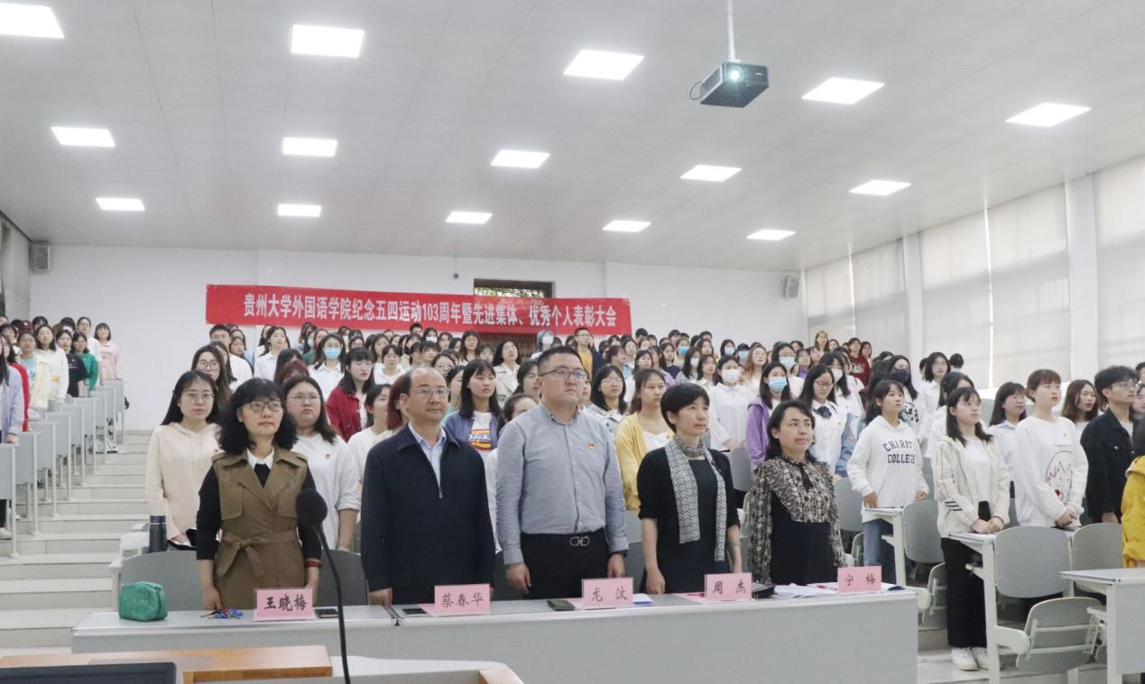 2022年5月9日,贵州大学外国语学院纪念五四运动103周年暨先进集体、优秀个人表彰大会在东校区法阶三教室举行。外国语学院党委书记龙汶、院长周杰、正处级组织员蔡春华、副院长宁梅、副院长王晓梅出席本次大会,参会教师有学生科韦伊、宋世君、潘晓翎、陈翌奇。参会学生由外国语学院本科生代表组成。