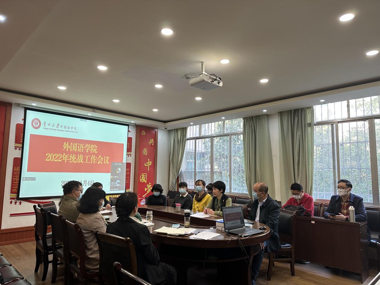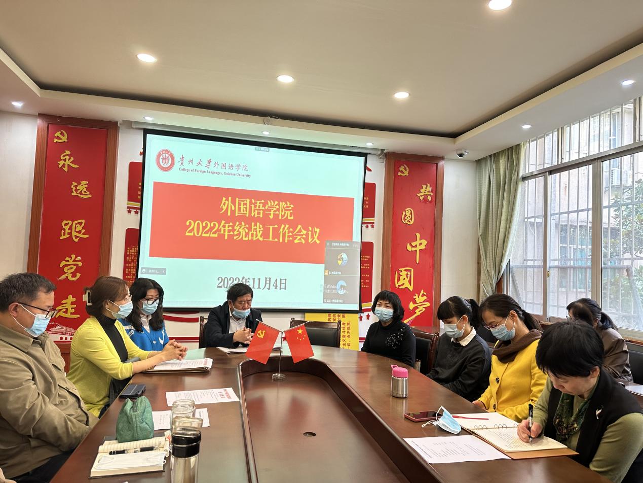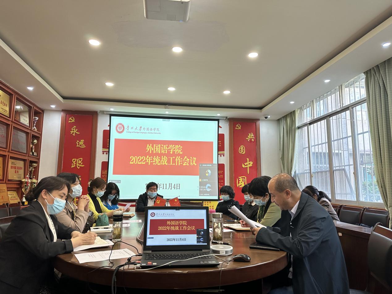 外国语学院讯2022年11月4日中午,我院在外语楼207会议室召开了2022年统战工作会议,学院党委书记龙汶、院长周杰、正处级组织员蔡春华、副院长宁梅、副院长王晓梅出席了会议,学院教职工中的10余名博士研究生学历或副高以上职称的民主党派和无党派人士参加了会议。根据学校安排,因龙汶书记目前在国家教育行政学院集中学习,因此他通过腾讯会议方式参加了本次会议。会议由宁梅副院长主持。