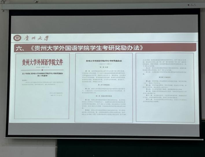 最后,龙汶书记就《贵州大学外国语学院学生考研奖励办法》文件进行了解读,鼓励我院学生积极报考研究生。此次的宣讲活动贯彻国家政策有助于对国家相关助学政策的实施情况进行贯彻、促进学校德育教育发展、辅助激励学生完成学业、普及家庭经济困难学生资助知识和确保国家资助政策顺利实施。