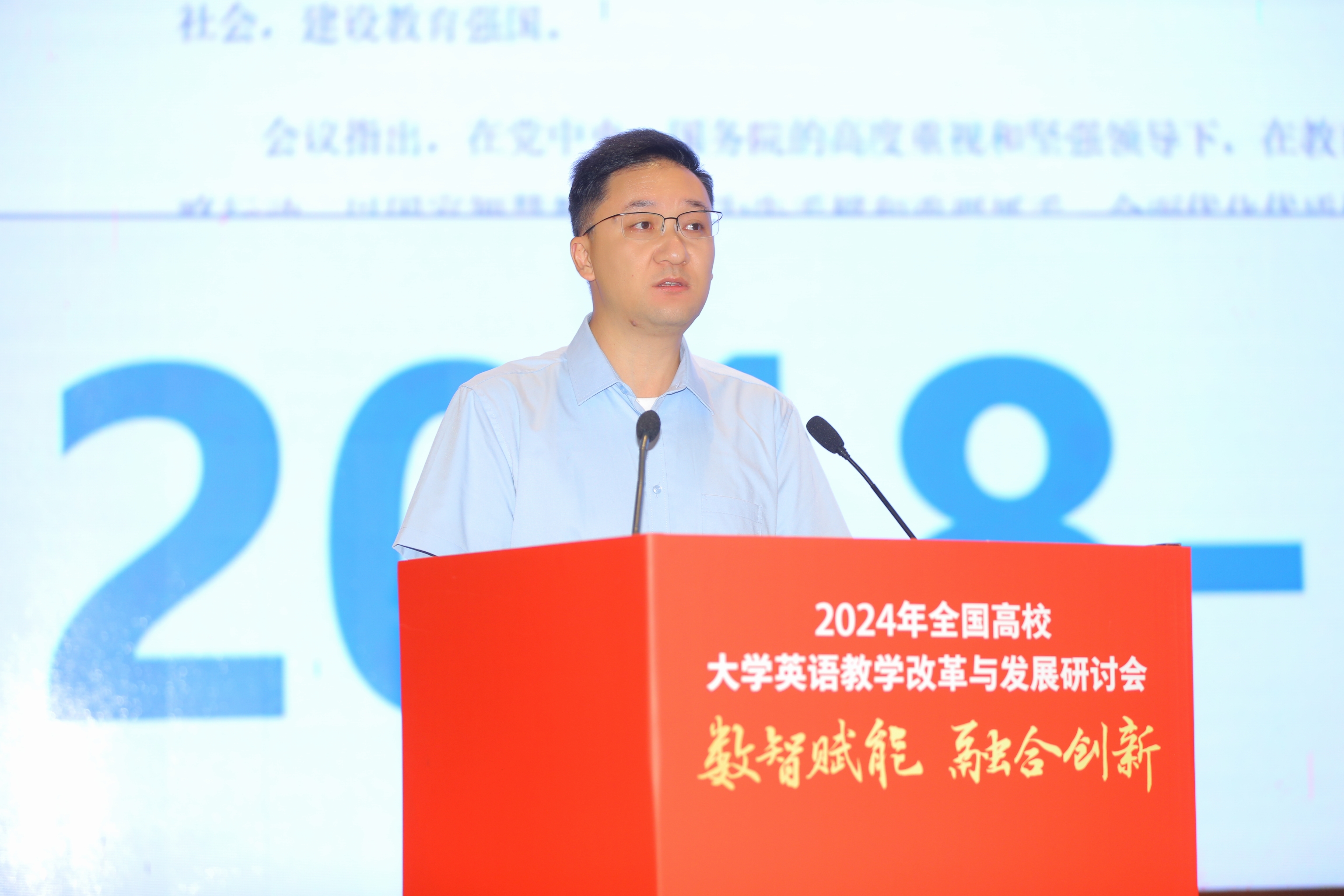 在开幕式上,贵州省教育厅高教处处长李晓飞首先致辞。李晓飞处长表示,深化大学英语教育教学改革既要聚焦外语课程思政建设、坚持落实立德树人根本任务,也要利用数智技术深化产教融合、科教融汇,进一步提升教育服务国家战略和区域经济社会发展的能力。