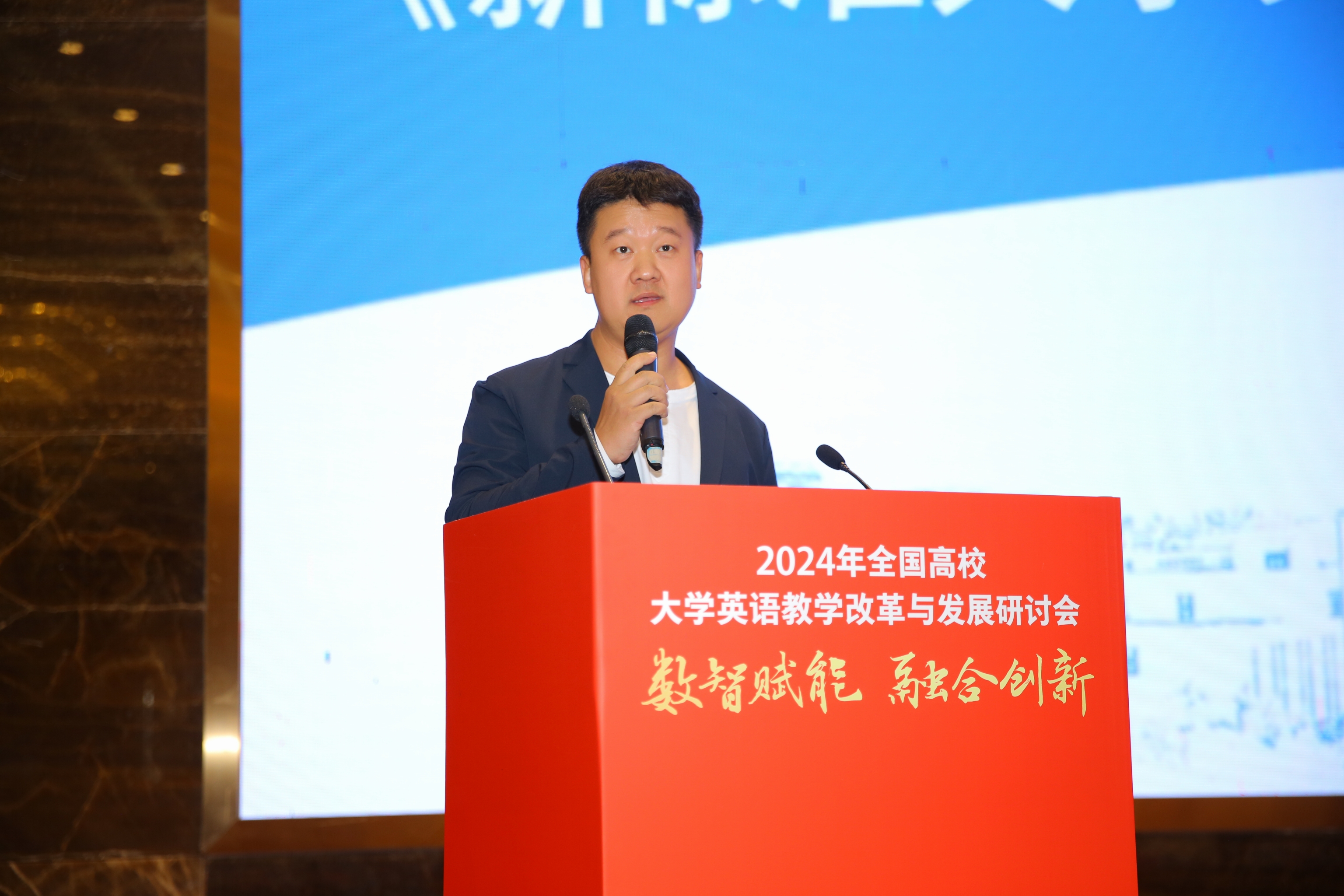 贵州大学外国语学院沈麟教授作了题为“人工智能赋能大学英语教与学——以U校园AI版辅助《新视野大学英语》(第四版)教学为例”的主旨报告。沈麟教授介绍了本校以人工智能赋能大学英语教与学的实践探索。沈教授表示,人工智能能够从知识目标、能力目标及素养目标三个维度助力有效提升外语课程教学效果,培养国际传播人才,并对本校在以上三方面的探索进行了简要介绍,包括开设AI选修课程、基于产出导向法丰富AI教学资源以及结合第二课堂教学实践创新AI+外语课堂等。沈教授以U校园智慧教学云平台AI版辅助《新视野大学英语》(第四版)教学实践为例,具体展示了U校园AI版中伴学数智人、在线交互式课件、智能评阅及学情分析等功能对“教、学、测、评”全流程的智能化支持。