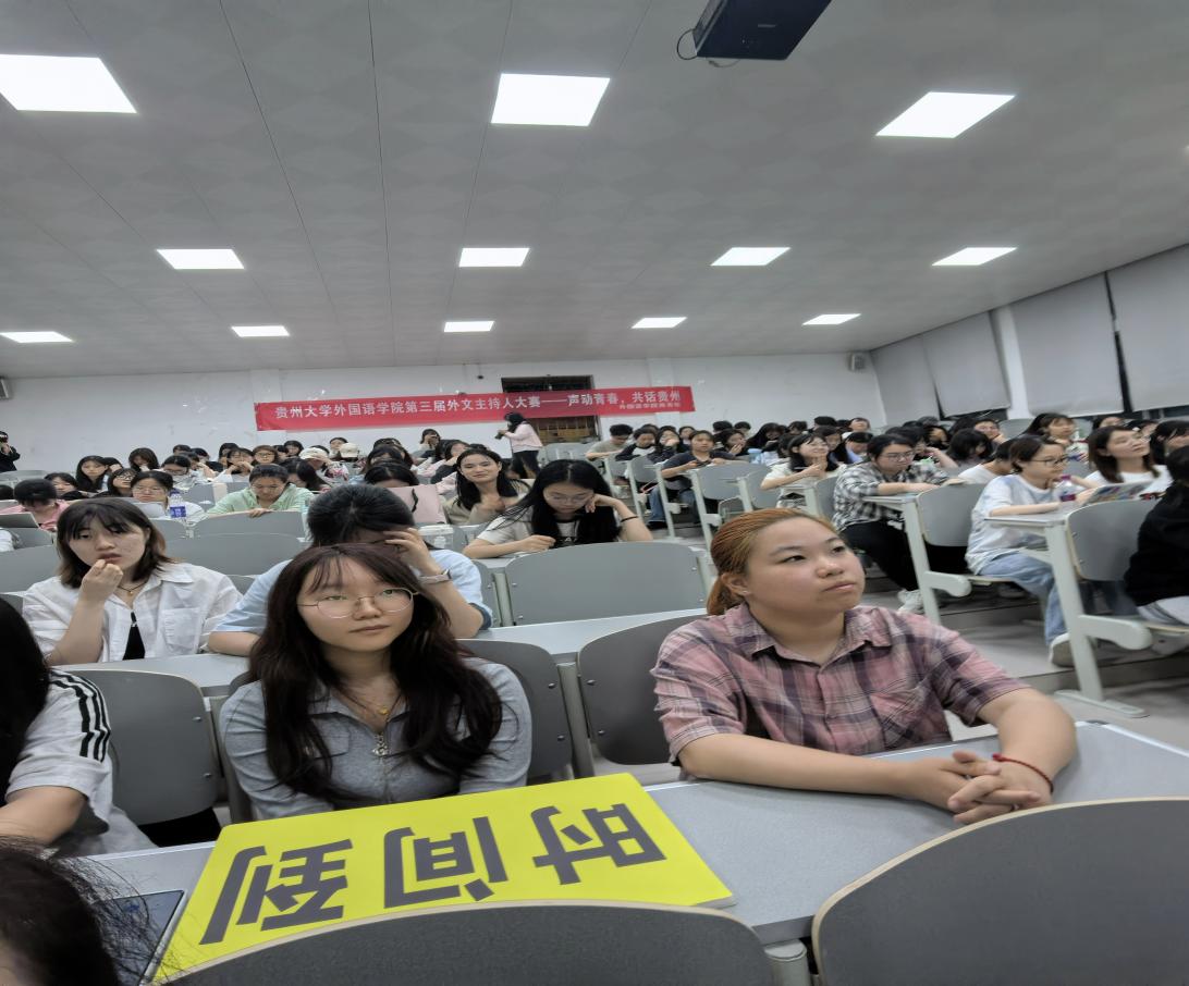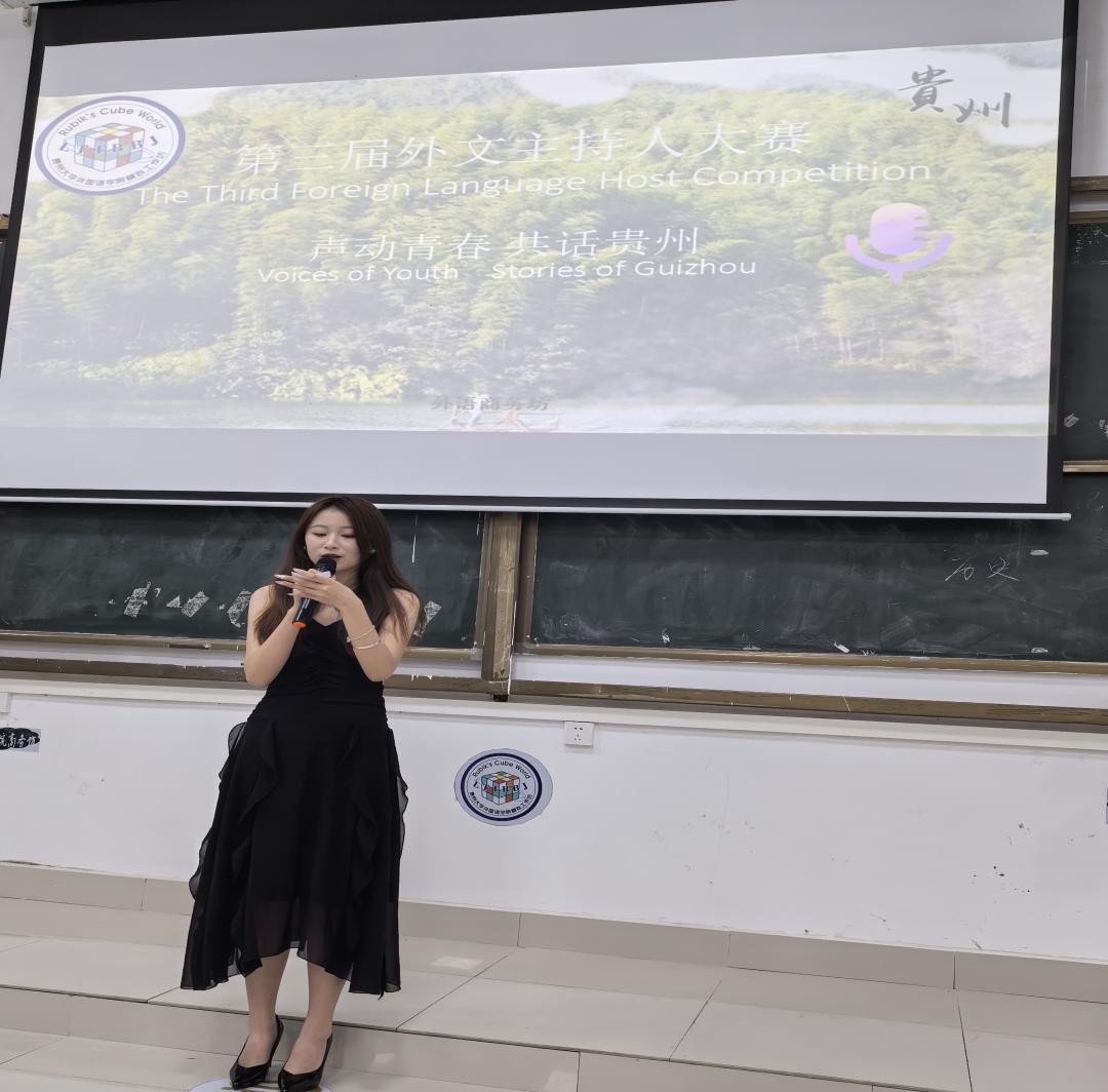 2023年5月21日晚,贵州大学外国语学院商务坊第三届外文主持大赛在贵州大学北校区法阶三举行。本次大赛由外国语学院院长周杰、副院长朱晓烽、商英系主任陈娟、缅甸语系教师贺舒、日语系教师余佳城担任评委,16名选手参与比赛,150余名观众到场观看。
