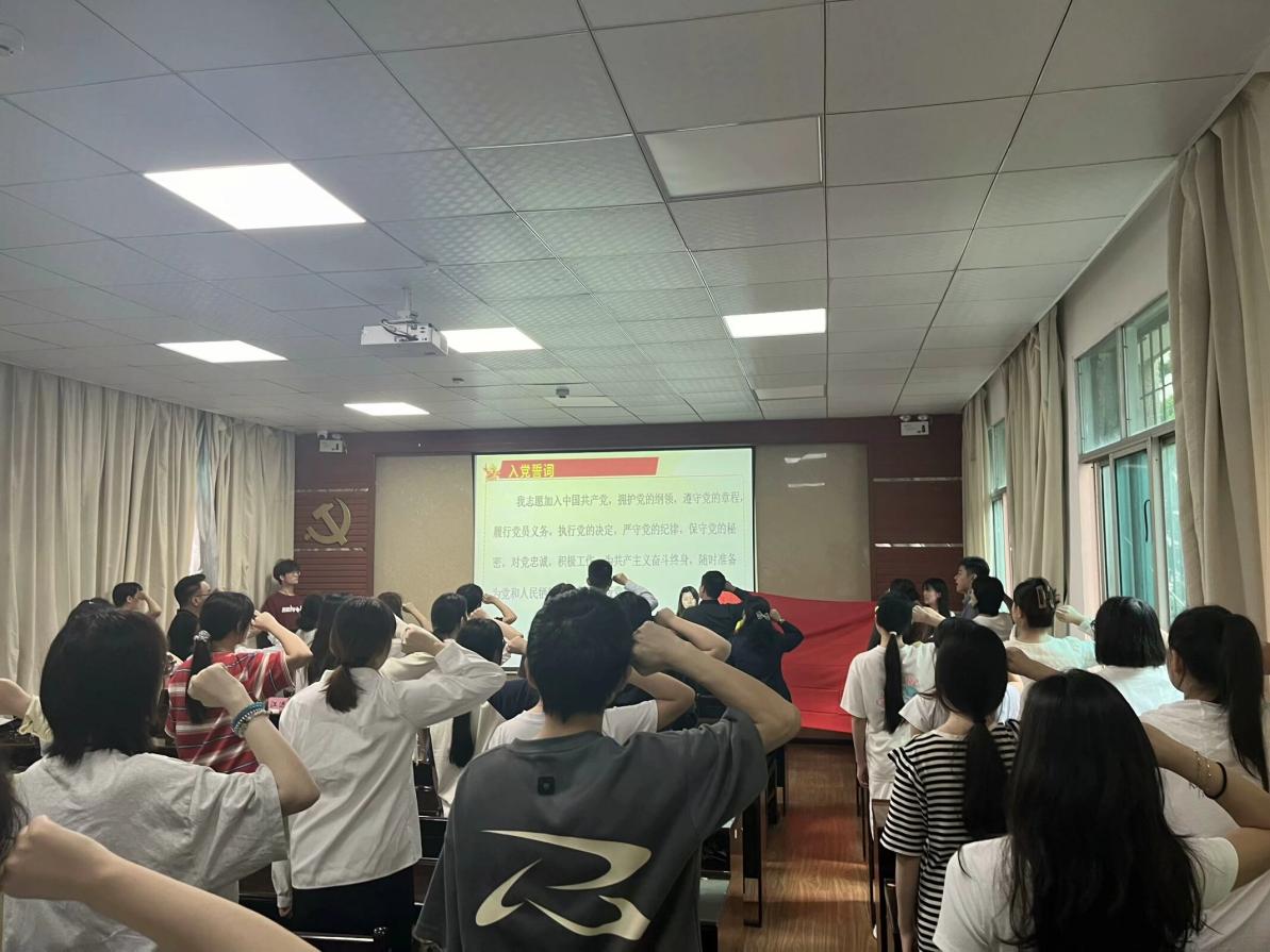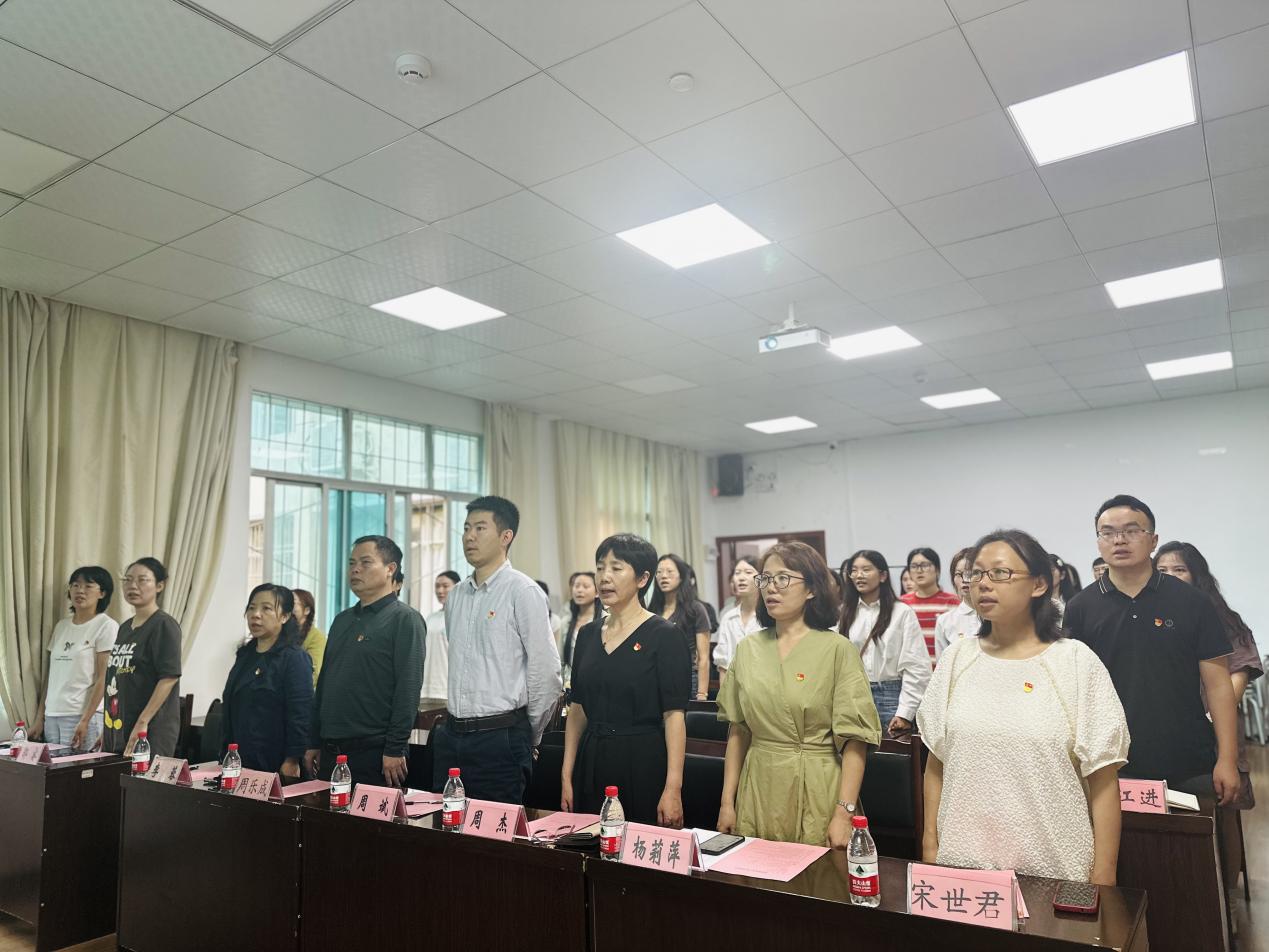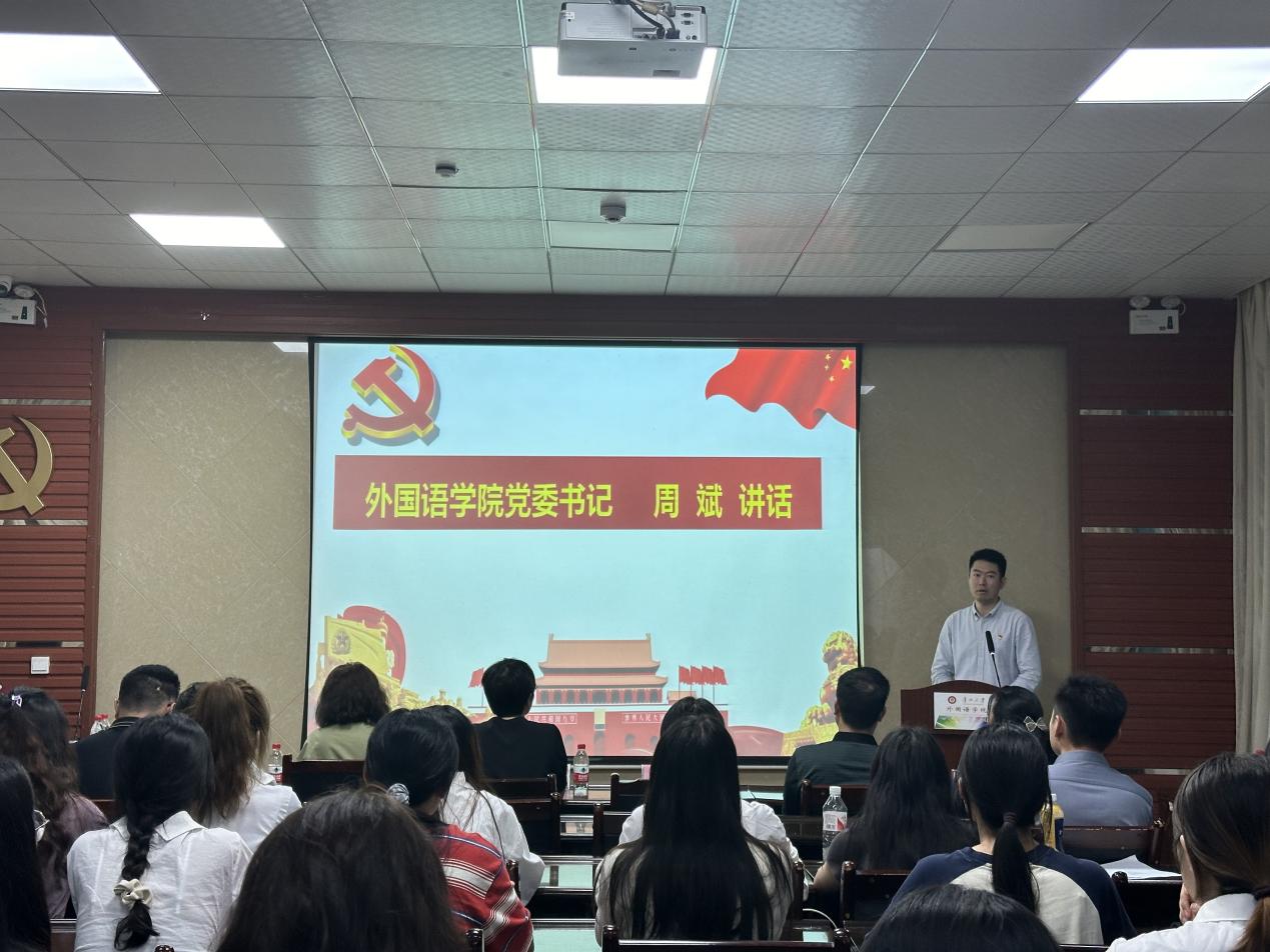 7月1日中午,外国语学院党委在东校区外语楼201室举行新党员入党宣誓仪式。外国语学院党委书记周斌,党委副书记、院长周杰,正处级组织员周乐成,党委副书记杨莉萍出席本次宣誓仪式。汉语国际教育硕士点研究生党支部等7个党支部支部书记和45名新发展党员参加。会议由学院分党校班主任穆佳男主持。