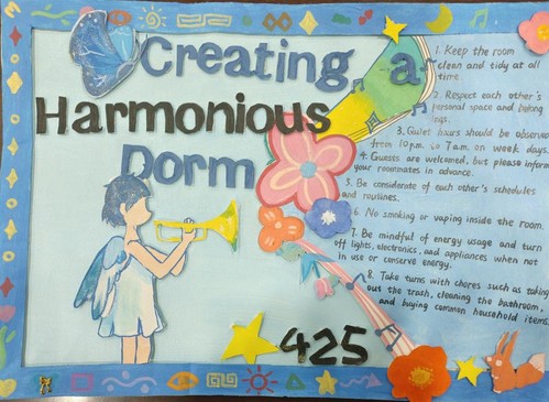此次比赛吸引了众多寝室积极参与。各寝室以团队协作的方式,精心设计寝室公约,内容涵盖寝室风貌展示、经费预算规划以及共同生活约定等多个方面。参赛作品色彩斑斓,精彩纷呈,文字与图案相得益彰,充分展现了各个寝室整洁温馨而又充满青春活力的独特魅力。