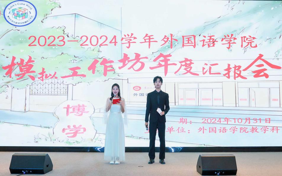 2024年10月31日晚,贵州大学外国语学院2023-2024年度创新创业“模拟工作坊”年度汇报总结大会在贵州大学东校区学术报告厅成功举办。本次活动由学院教学科主办,宁波瑞孚集团进出口有限责任公司协办。外国语学院院长周杰、副书记杨莉萍、副院长王晓梅、副院长朱晓烽、模拟工作坊负责人李蓉、宁波瑞孚集团人力资源部总监、外国语学院实习基地校外指导教师周雪娜出席,各坊队指导老师等参加了此次汇报会。
