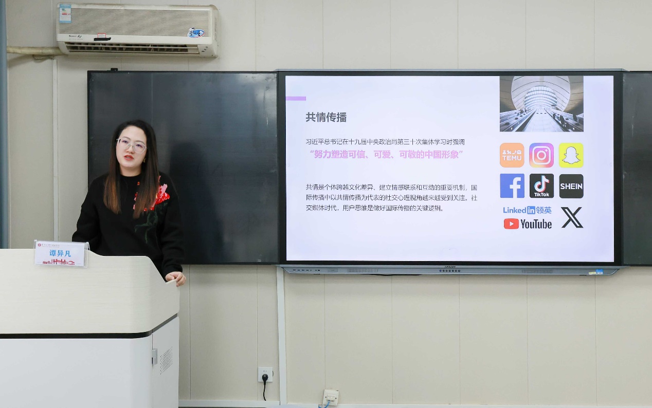 谭异凡首先和同学们分享了自己从事新闻传媒从零做起的工作经历。随后,她分别从“人工智能背景下的外语专业”“全球传播发展趋势”“数字时代城市国际传播路径”以及“深圳的国际传播尝试”四个方面进行讲解。谭异凡提到国际传播已成为全球趋势,共情传播是做好国际传播的关键,并列举了洛杉矶城市形象传播的成功案例。最后,谭异凡详细介绍了深圳城市国际形象推广的具体情况,指出扩大和推广国际传播,不仅需要能够驾驭多语言及开展跨文化交流的多面手,也要发挥外语人才在中外联通中的信息差转换能力。