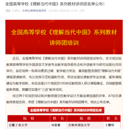 12月5日,全国高等学校《理解当代中国》系列教材讲师团名单公布,我院教授沈麟成为贵州省唯一入选的教师,这是对教师个人专业能力的认可,也是对贵州大学外国语学院在推广和教授《理解当代中国》系列课程中所做努力的肯定。