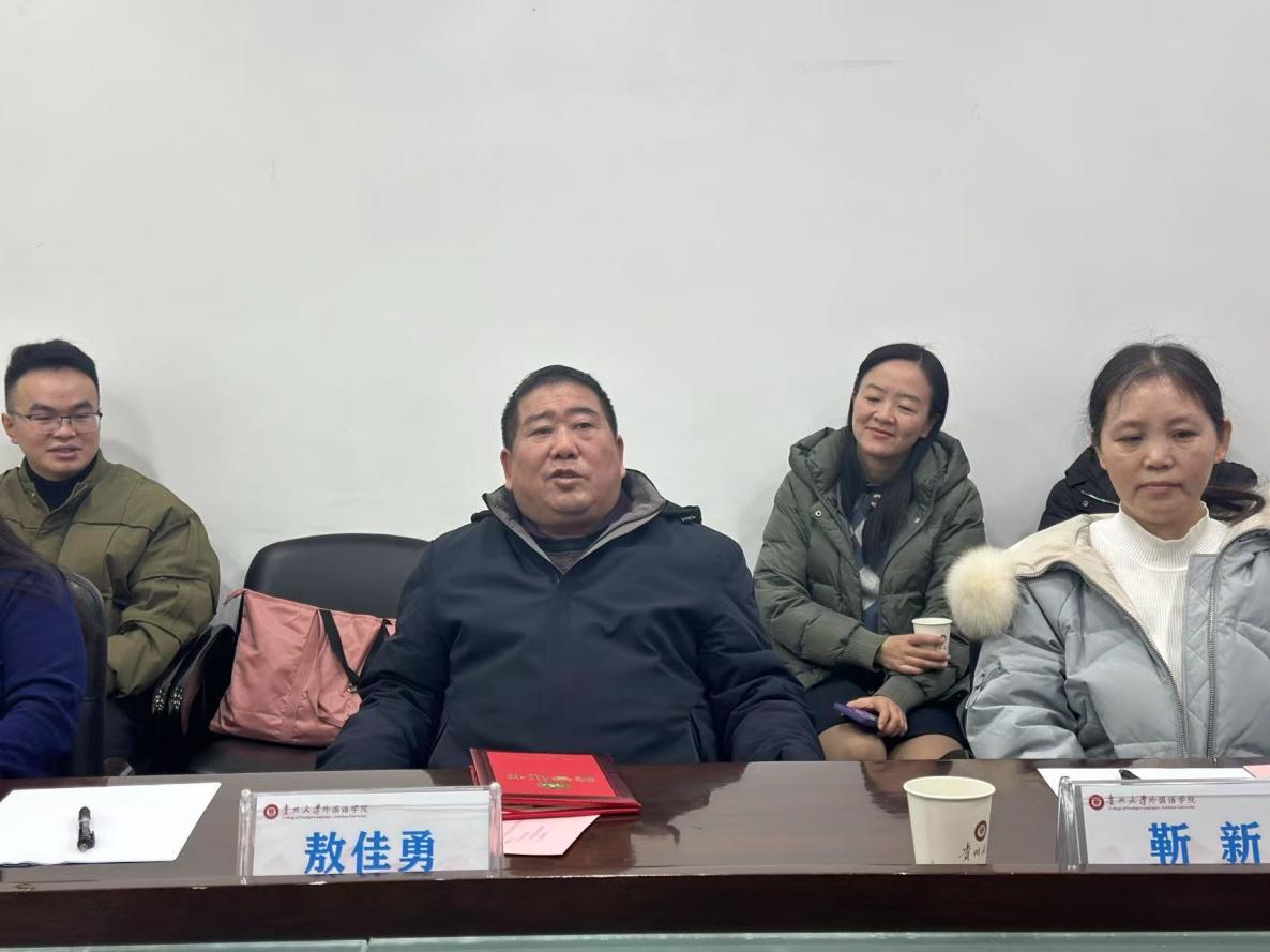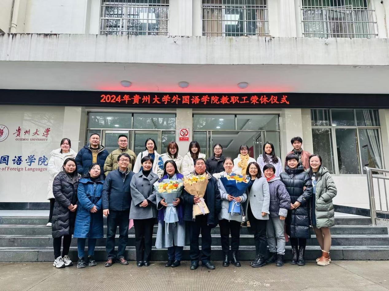 薪火传承守初心、凝心聚力担使命,2024年12月27日下午,外国语学院举行退休教职工荣休仪式。外国语学院院长周杰、党委副书记兼分工会主席杨莉萍、副院长朱晓烽出席仪式,2024年退休教职工代表敖佳勇、靳新、陈燕华,各科室、系(教研室)负责人、工会小组长,2024年新进教师、教师代表、学生代表参会。会议由杨莉萍主持。
