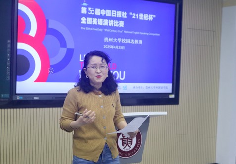 “以言舟,逐梦星辰!”2025年4月25日,第三十届中国日报社“21世纪杯”全国英语演讲比赛贵州大学校园选拔赛于明俊楼221教室璀璨启幕。本次比赛以“Living Within and Beyond the 21st Century”主题,吸引全校学子踊跃参与,经过层层选拔,在决赛舞台上以语言刃,展思维锋芒。