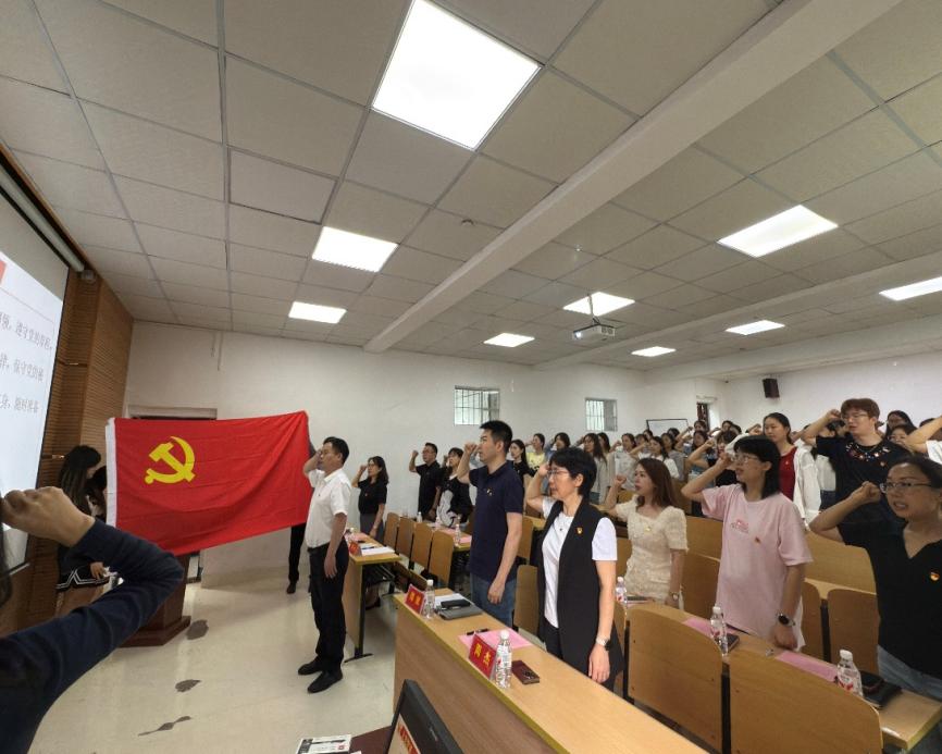 周杰为新发展党员代表佩戴党徽,各党支部书记为新发展党员佩戴党徽。党徽的佩戴不仅象征着党员身份的确认,更意味着责任与使命的传承。随后,正处级组织员周乐成领誓,全体党员持立正姿势,举右拳,向鲜红的党旗庄严宣誓,向党和人民作出庄严承诺。