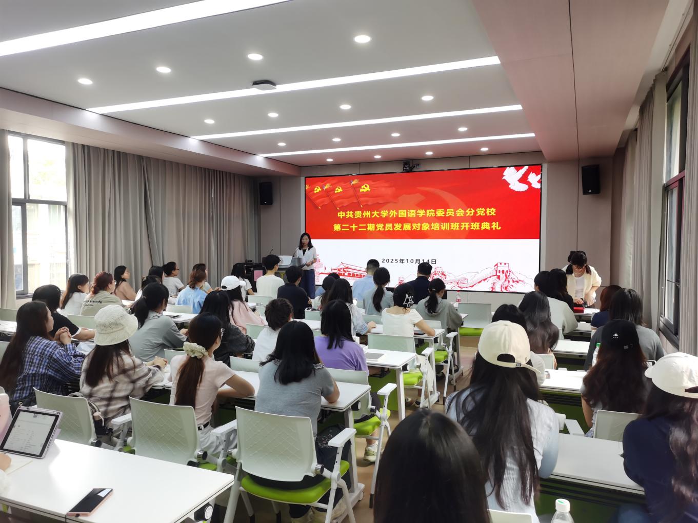 2025年10月14日,中共贵州大学外国语学院委员会分党校第二十二期党员发展对象培训班开班典礼在外国语学院201会议室举行。校关工委副主任匡萍波、外国语学院党委书记周斌、正处级组织员周乐成、各党支部书记及全体培训班学员参加典礼。