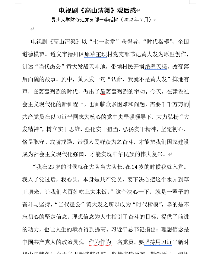 《高山清渠》(原名《黄大发的奋斗史》),自2022年7月16日(星期六)播出起,我处全体职工均认真进行了收看,党员干部纷纷撰写观后感。