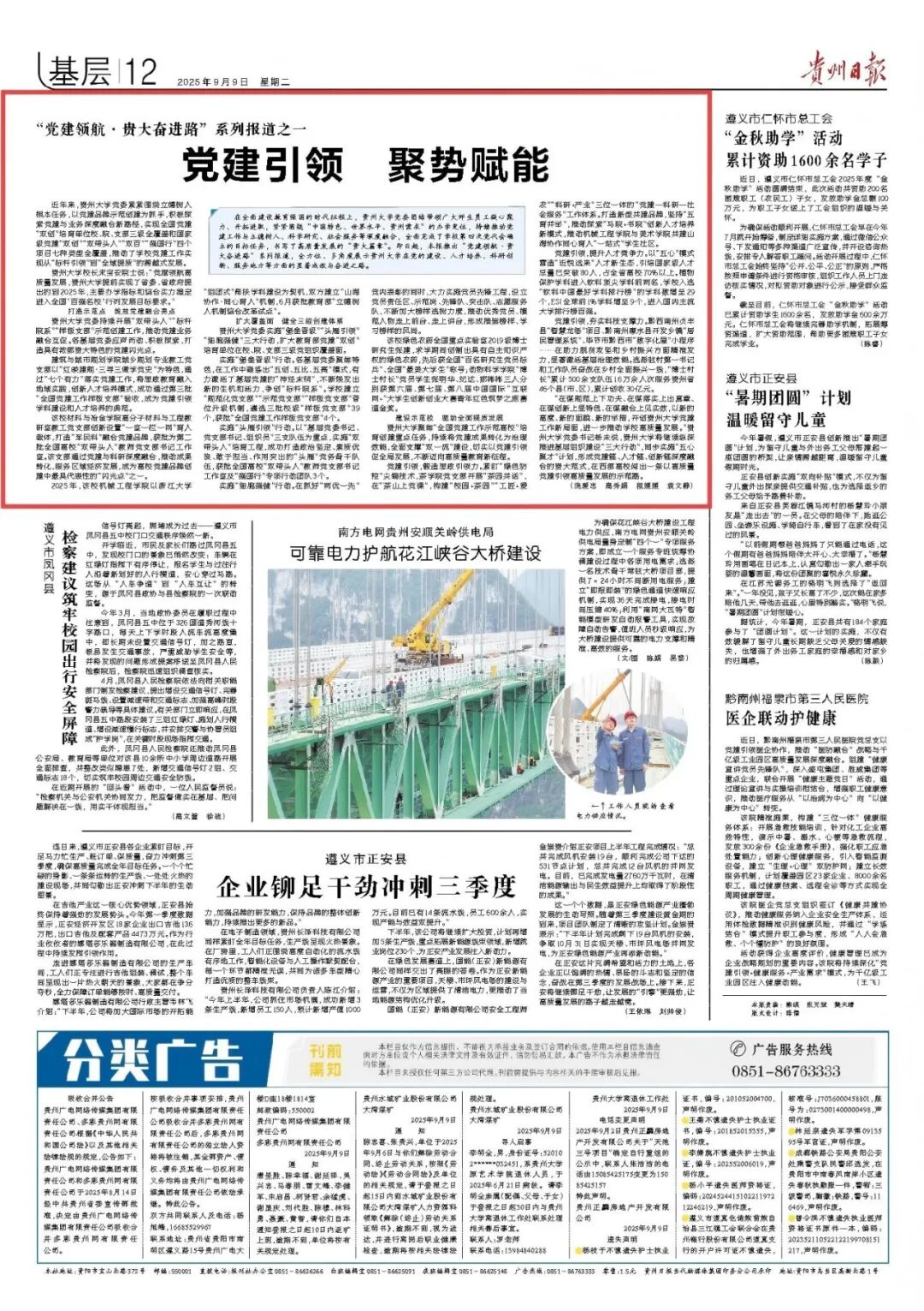 在全面建设教育强国的时代征程上,贵州大学党委团结带领广大师生员工凝心聚力、开拓进取,紧紧围绕“中国特色、世界水平、贵州需求”的办学定位,持续推动党建工作与立德树人、科学研究、社会服务等深度融合,全面完成了学校第四次党代会确立的目标任务,书写了高质量发展的“贵大篇章”。即日起,《贵州日报》将推出“党建领航·贵大奋进路”系列报道,全方位、多角度展示贵州大学在党的建设、人才培养、科研创新、服务地方等方面的显著成效与奋进之路。