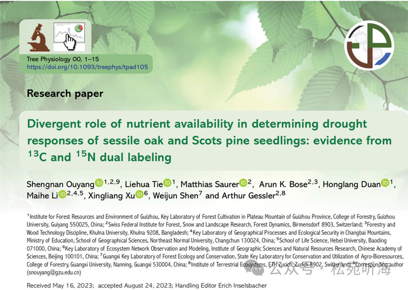 近日,贵州大学贵州省森林资源与环境研究中心欧阳胜男副教授、段洪浪教授、铁烈华副教授联合广西大学申卫军教授、瑞士联邦森林、雪与景观研究所Arthur Gessler教授、李迈和教授等相关学者在国际林学经典期刊《Tree Physiology》上发表题为 “Divergent role of nutrient availability in determining drought responses of sessile oak and Scots pine seedlings: evidence from 13C and 15N dual labeling”的研究论文,详细阐述了干旱前期养分添加对无梗花栎(Quercus petraea)和欧洲赤松(Pinus sylvestris)干旱响应中碳-氮利用方式的影响。研究结果表明养分有效性在植物干旱响应中的作用受养分添加浓度及树种的影响。该成果是继欧阳胜男于2021年在《Tree physiology》发表题为“Root carbon and nutrient homeostasis determines downy oak sapling survival and recovery from drought”科研论文的持续深入研究。