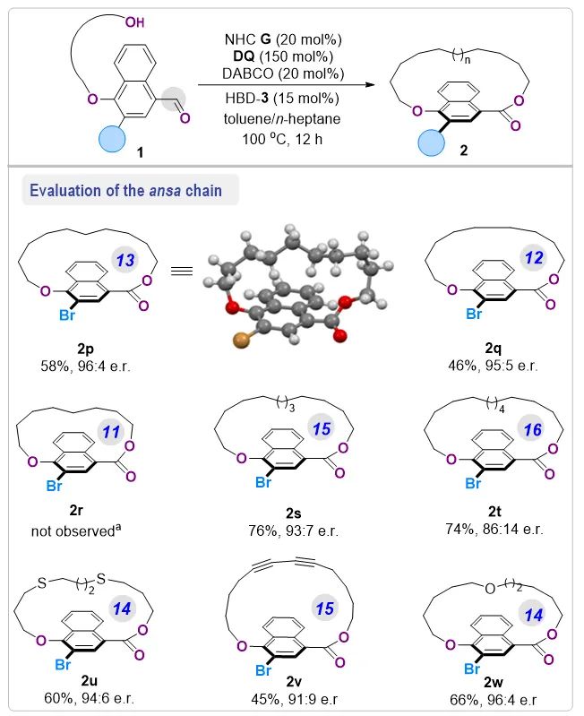 接下来,作者通过改变侧链的长度以制备具有各种环尺寸的大环内酯产物(图4)。具有13元或12元长度侧链的底物能够以优异的对映选择性得到相应的平面手性大环内酯2p (17元大环内酯)和2q (16元大环内酯)。在最佳条件下,将侧链长度进一步减少到11元时未能得到相应的产物2r,这可能是由于链长过短以至于形成的大环刚性过强的原因;另一方面,侧链长度可以很容易地延伸到15元和16元,分别以93:7和86:14 er产生产物2s和2t。此外,还能以良好的产率和er值得到侧链中引入各种官能化连接体的大环内酯产物,如硫醚(2u)、1,3-二炔(2v)和醚(2w)。
