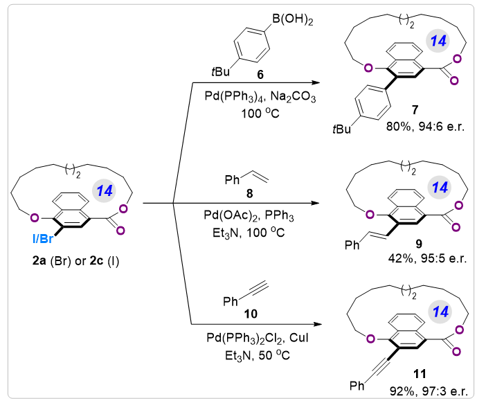 作者也将该方法中制备的光学纯面手性大环内酯开展了进一步的合成转化(图5)。2a和6可通过钯催化的Suzuki交叉偶联反应以80%的产率和94:6 er得到大环内酯7。其它过渡金属催化的偶联也可顺利进行,例如,通过Pd(OAc)2/PPh3与苯乙烯8进行Heck反应,以42%的产率和95:5的er得到面手性大环9。此外,2c与末端炔烃10可通过Sonogashira偶联反应得到产物11。
